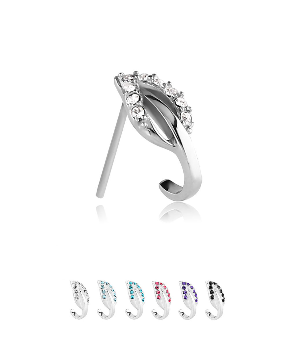 925 Sterling Silver nose stud with a 5mmx11mm Leaf CZ design, available in your choice of style, color and gauge. The design wraps around on the inside of the nostril.