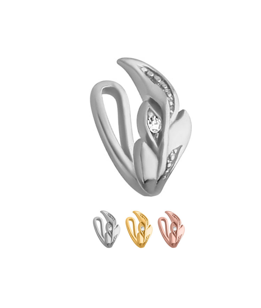 Get the look without the commitment with these faux nose hugger rings. This 925 Sterling Silver faux clip-on nose hugger has a leaf design that measures 5mmX11mm with a 1mm stone. Designed for maximum comfort and ease of wear.