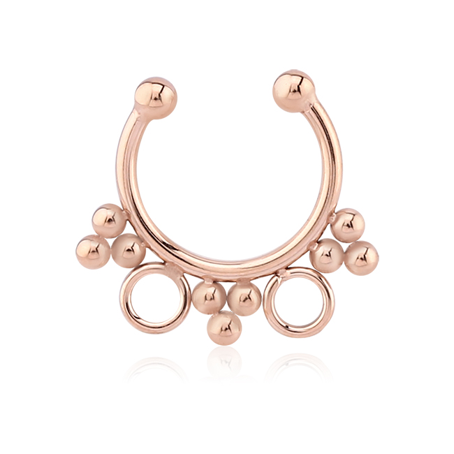Rose Gold PVD Coated 316L Surgical Steel fake clip-on septum ring that can be used in several piercings including nose, ear, septum and ear cartilage. This clip-on septum ring measures 17mmX16mm with an inner diameter of 10mm