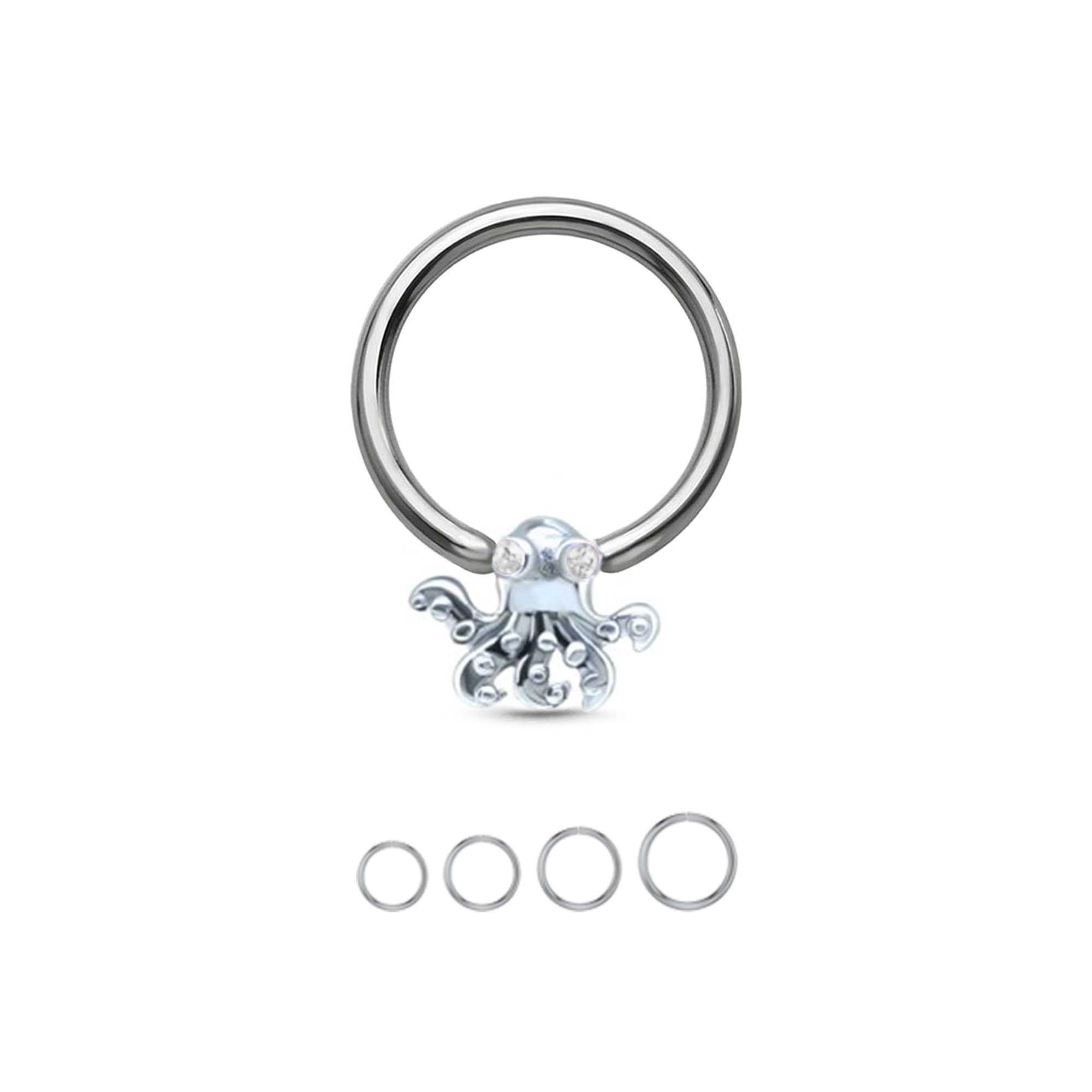 The hoop features a captive bead charm, which is not fixed to the hoop and can be easily removed. Each bead has two small indents on either side. The indents must be lined up with the ends of the nose hoop's post in order to lock the bead in place. If there is too much space between the ends of the hoop the bead will not stay in place, the 2 ends will need to be pushed closer together to secure it.
