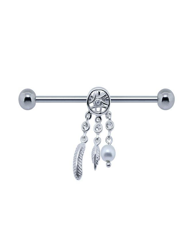 316L Surgical Steel industrial barbell with a beautiful dream catcher design.