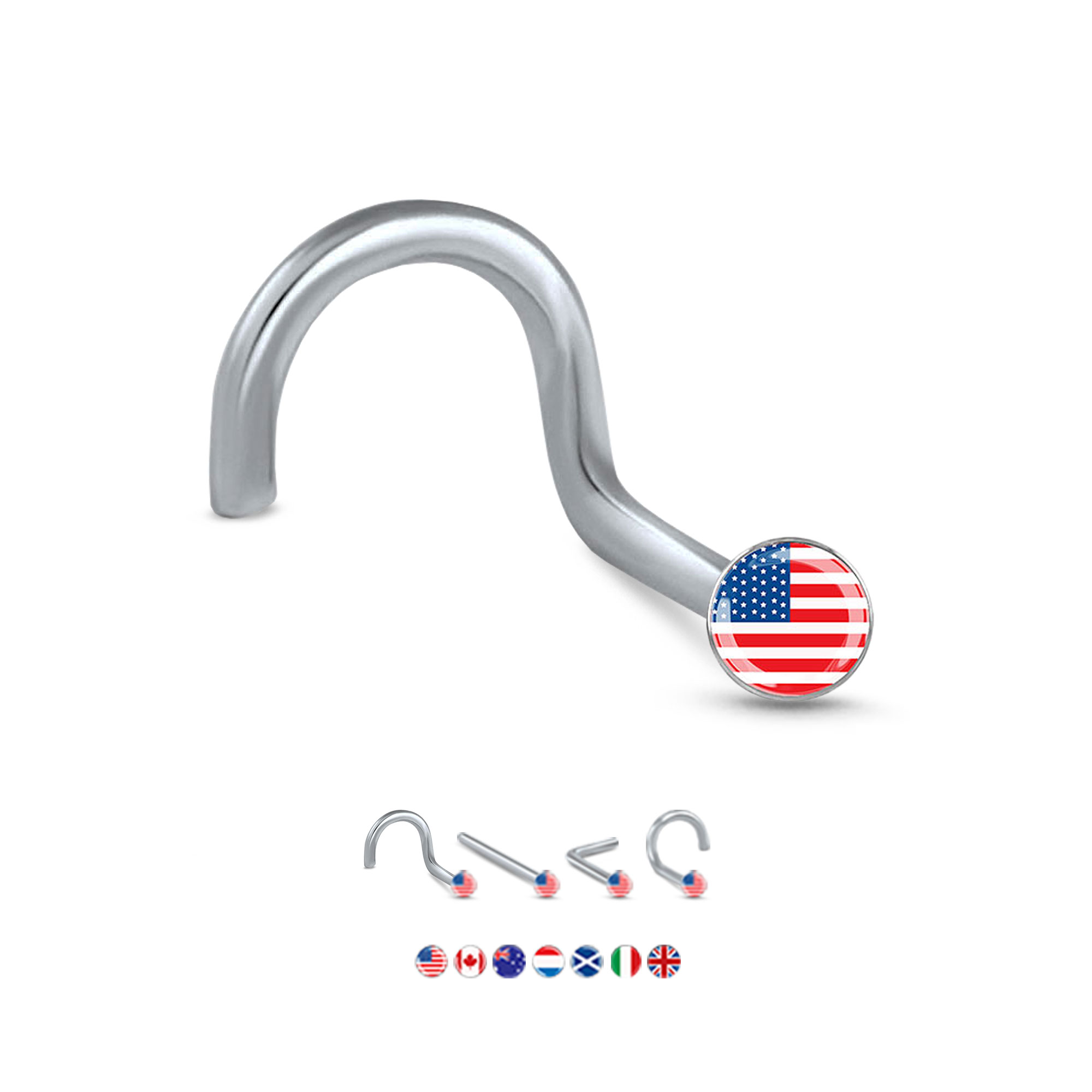 316L Surgical Steel nose stud with a 2mm flag design, available in your choice of country and style.